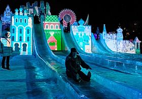 Фестиваль ледяных скульптур "Снег и Лед" в парке Музеон. Жанровая фотография. Люди прогуливаются…