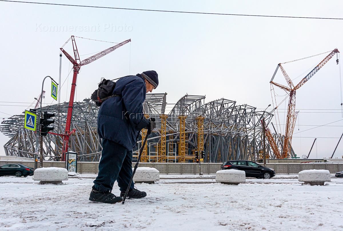 Виды Санкт-Петербурга. Жанровая фотография. Пожилой человек на фоне строящегося стадиона "СКА Арена"…