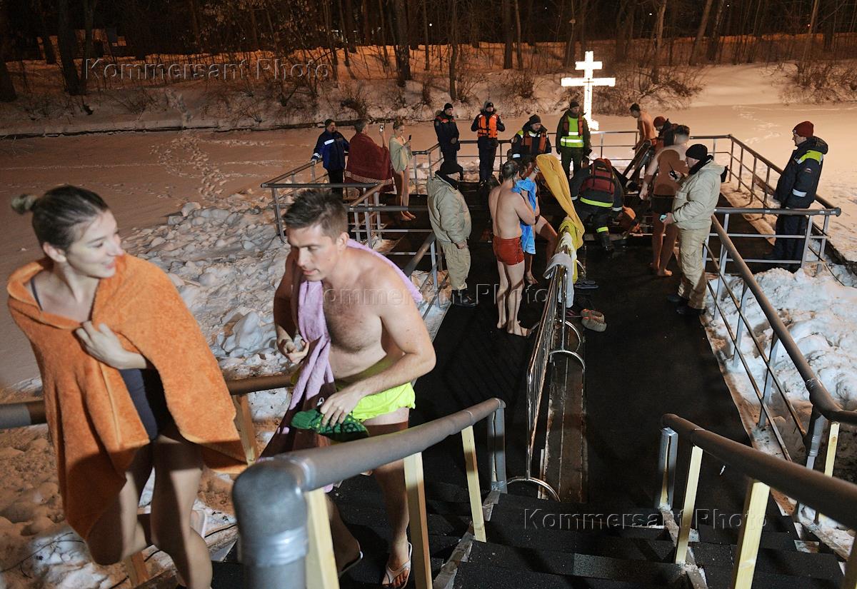 Праздник Крещения Господня. Крещенские купания в Нижнем майском пруду в Сокольниках. Люди у купели.