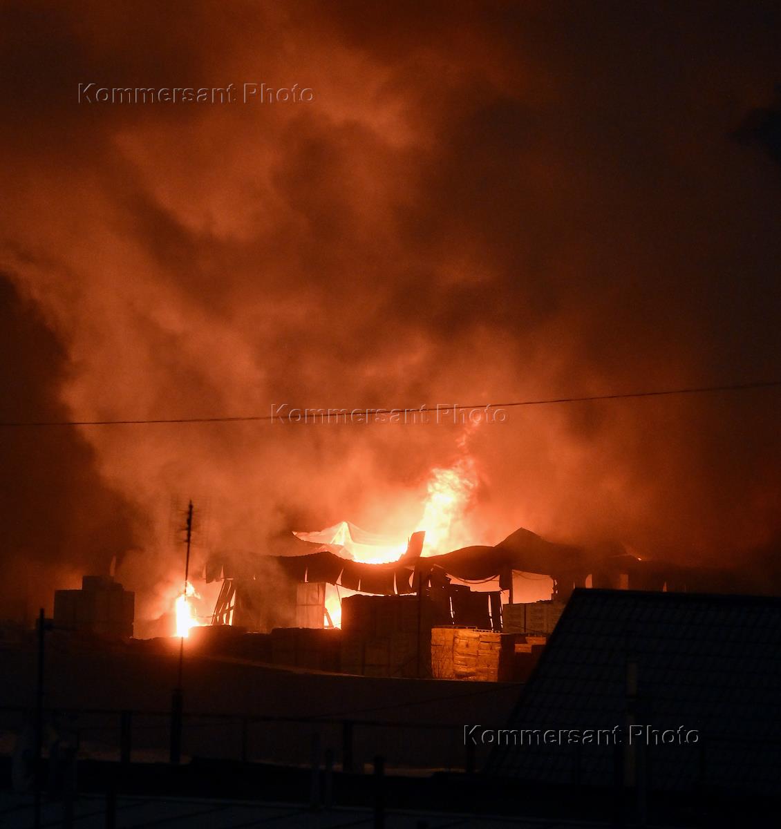 Пожар в складском помещении на территории рынка "Синдика" в районе Мякинино.