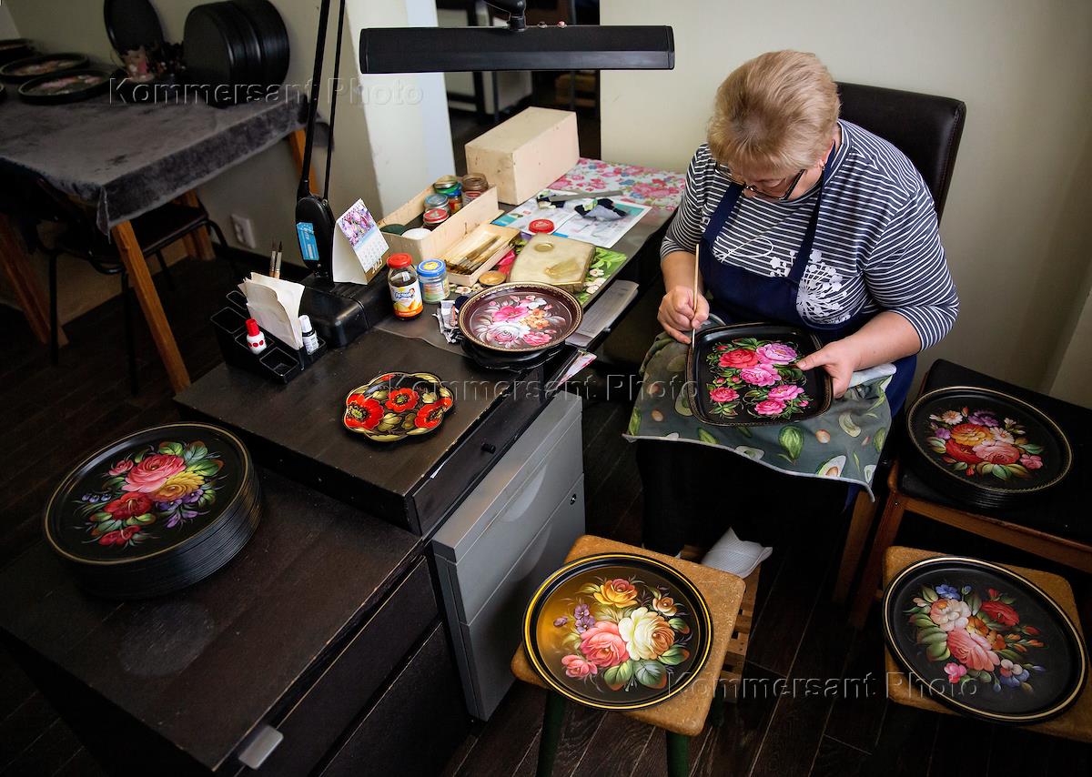 Жостовская фабрика декоративной росписи. Жанровая фотография. Художник рисует орнамент на подносе.