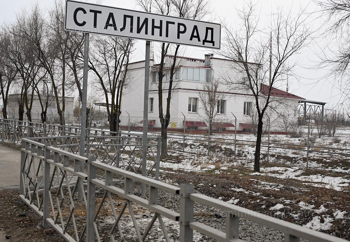 Жанровая фотография. Дорожный указатель с временным переименованием города Волгоград в Сталинград,…