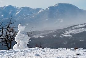 Виды Крыма зимой. Жанровая фотография. Снеговик на фоне гор в районе водопада Учан-Су.