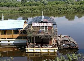 строение на понтонах на реке Ока. Вывеска "Русская баня".