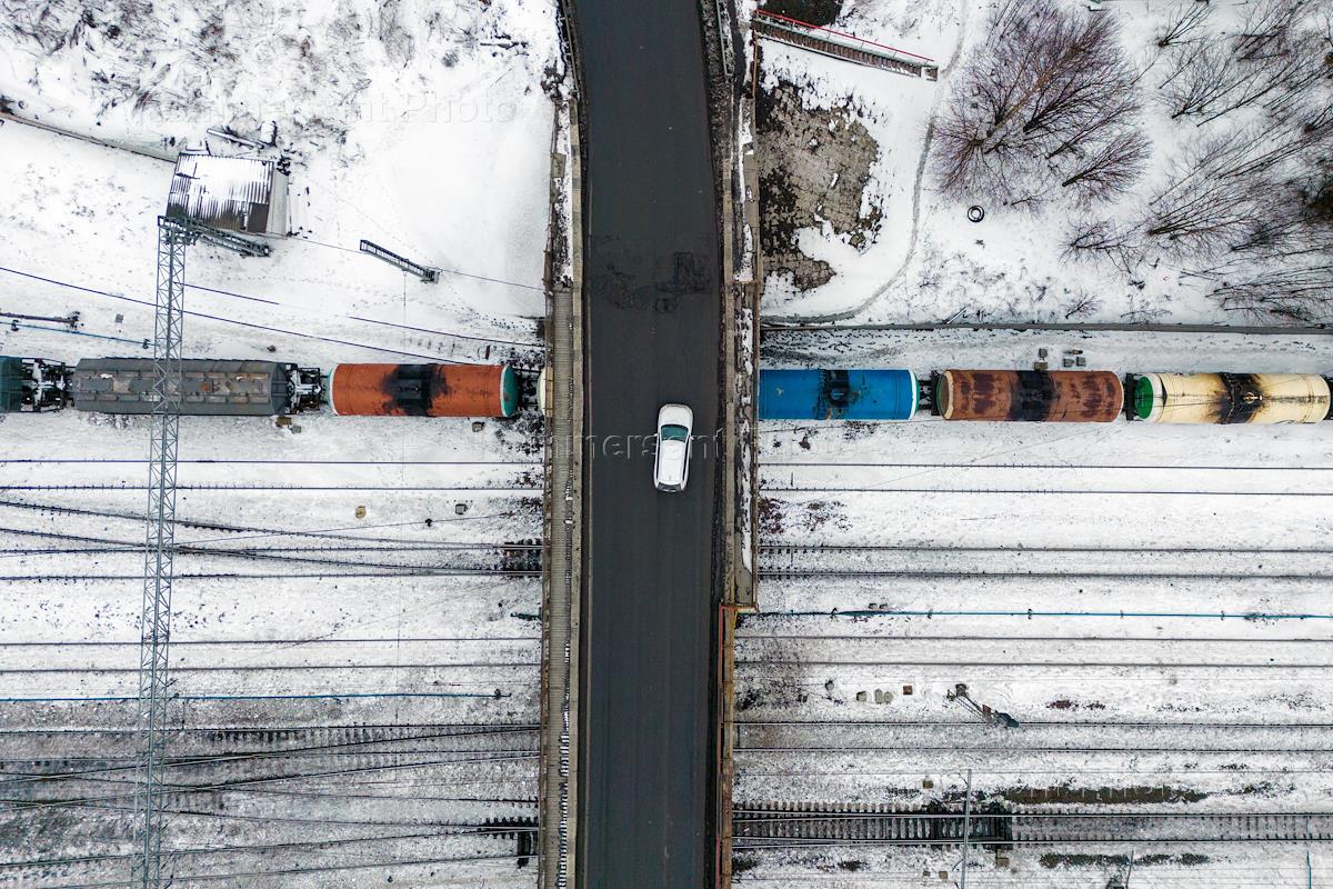 Жанровая фотография. Автомобиль движется по эстакаде над железнодорожными путями.