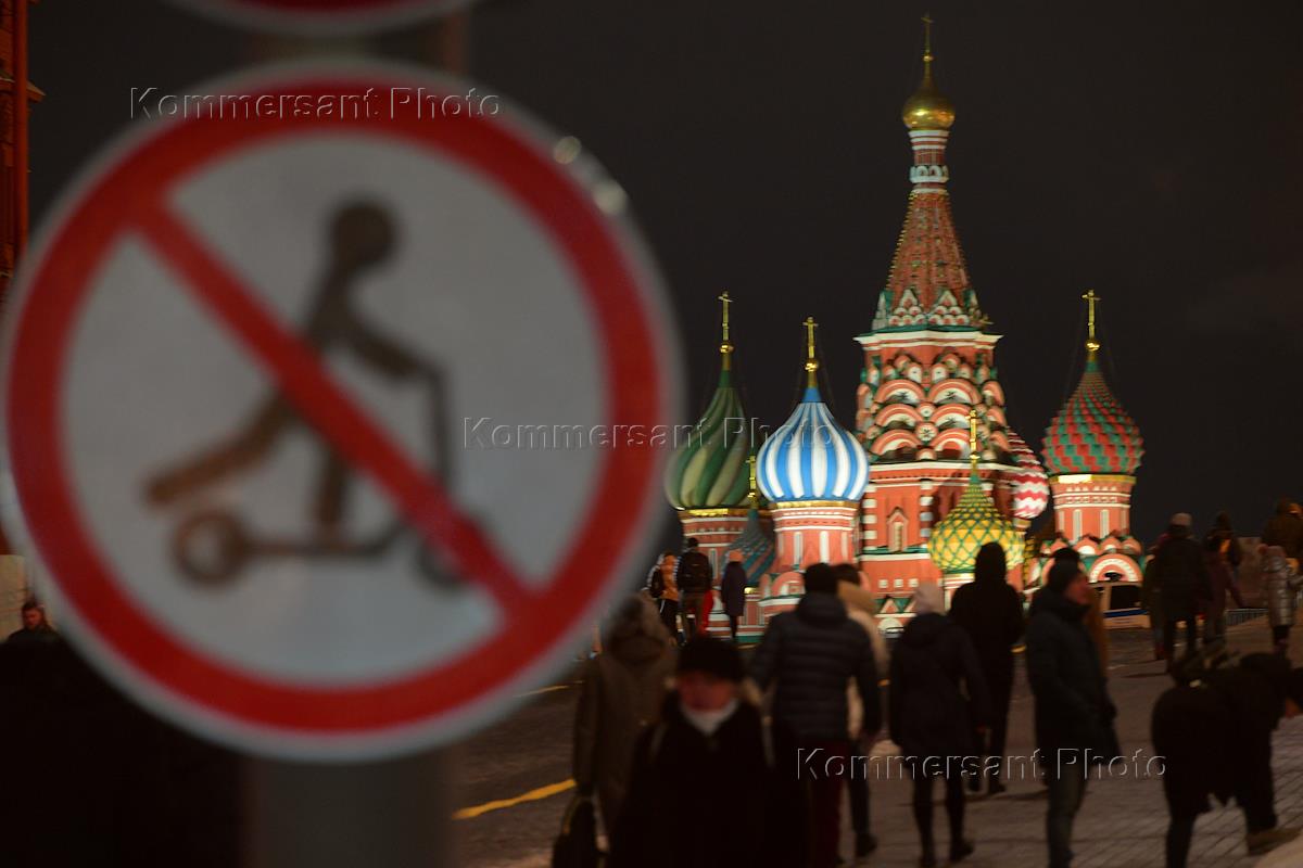 Виды Москвы. Жанровая фотография. Дорожный знак "Движение на самокатах запрещено" на фоне храма…