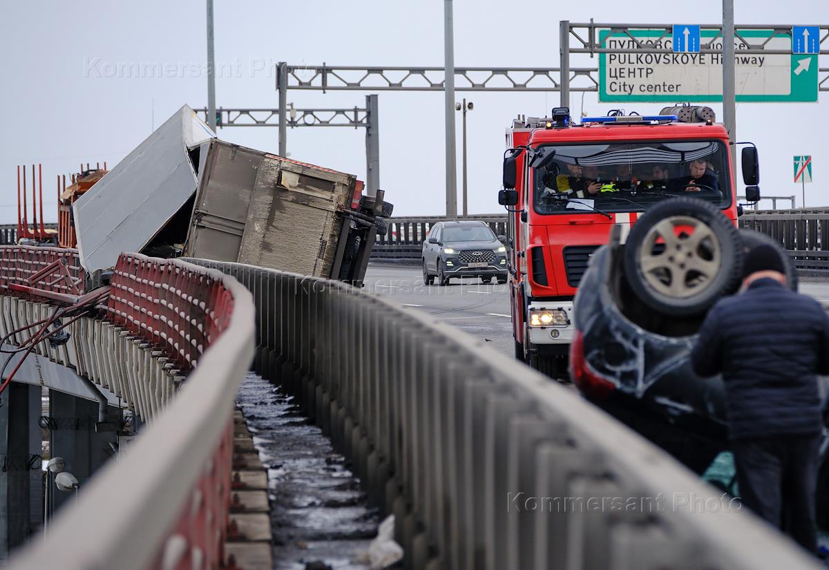 Последствия дорожно-транспортного происшествия (ДТП) на развязке КАД в районе Пулковского шоссе.…