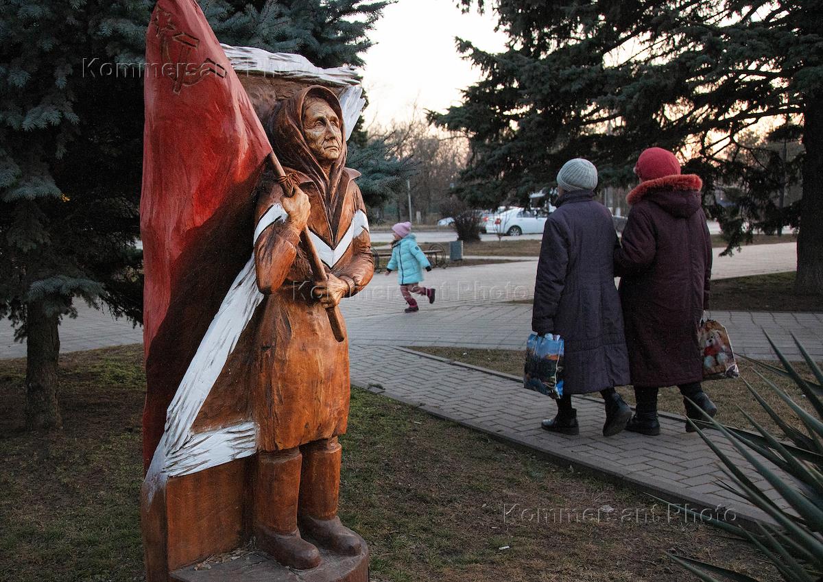 Жанровая фотография. Деревянная скульптура "Бабушка с красным флагом" на площади Победы.
