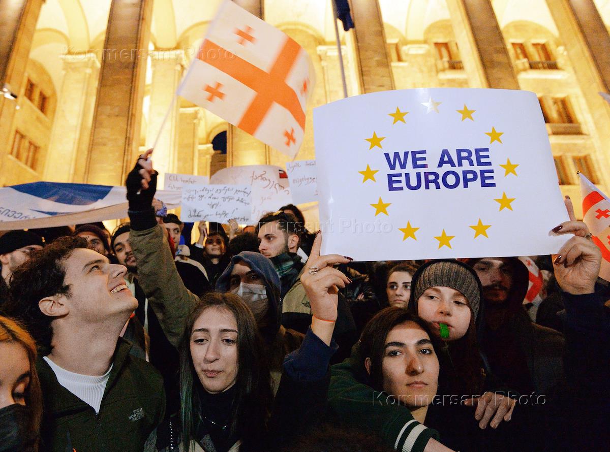 Акция протеста против законопроекта об иноагентах в центре Тбилиси. Участники акции во время…