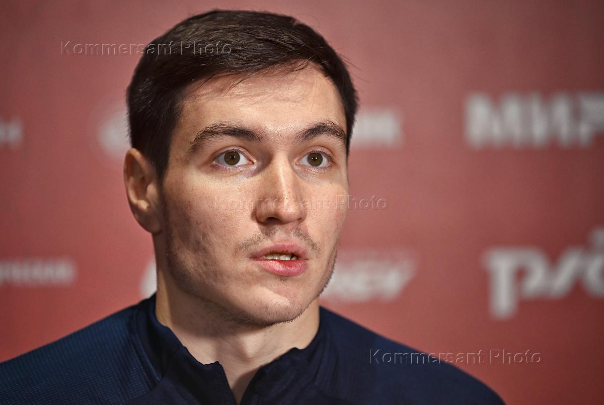 Игрок сборной России по футболу Иван Обляков во время брифинга на учебно-тренировочной базе…