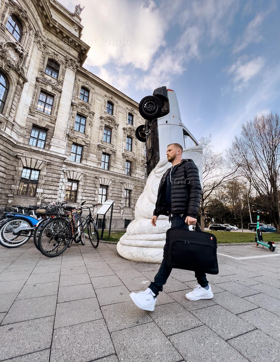 Виды Мюнхена. Статуя перевернутого автомобиля на площади в городе.