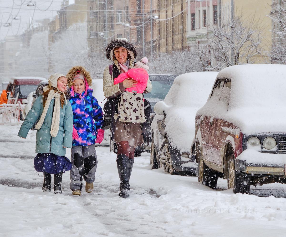 Жанровая фотография. Снегопад в городе. Женщина с детьми идет по улице во время снегопада.