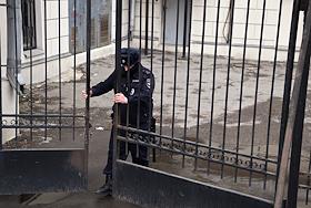 Виды Москвы. Жанровая фотография. Сотрудник полиции открывает ворота на территорию Лефортовского…