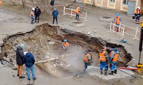 Сотрудники коммунальных служб города на месте прорыва трубы и размыва дорожного полотна по улице…