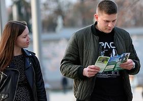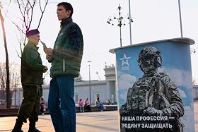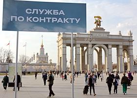 Работа информационного стенда, посвящённого контрактной службе в армии на входе в выставочный комплекс ВДНХ.