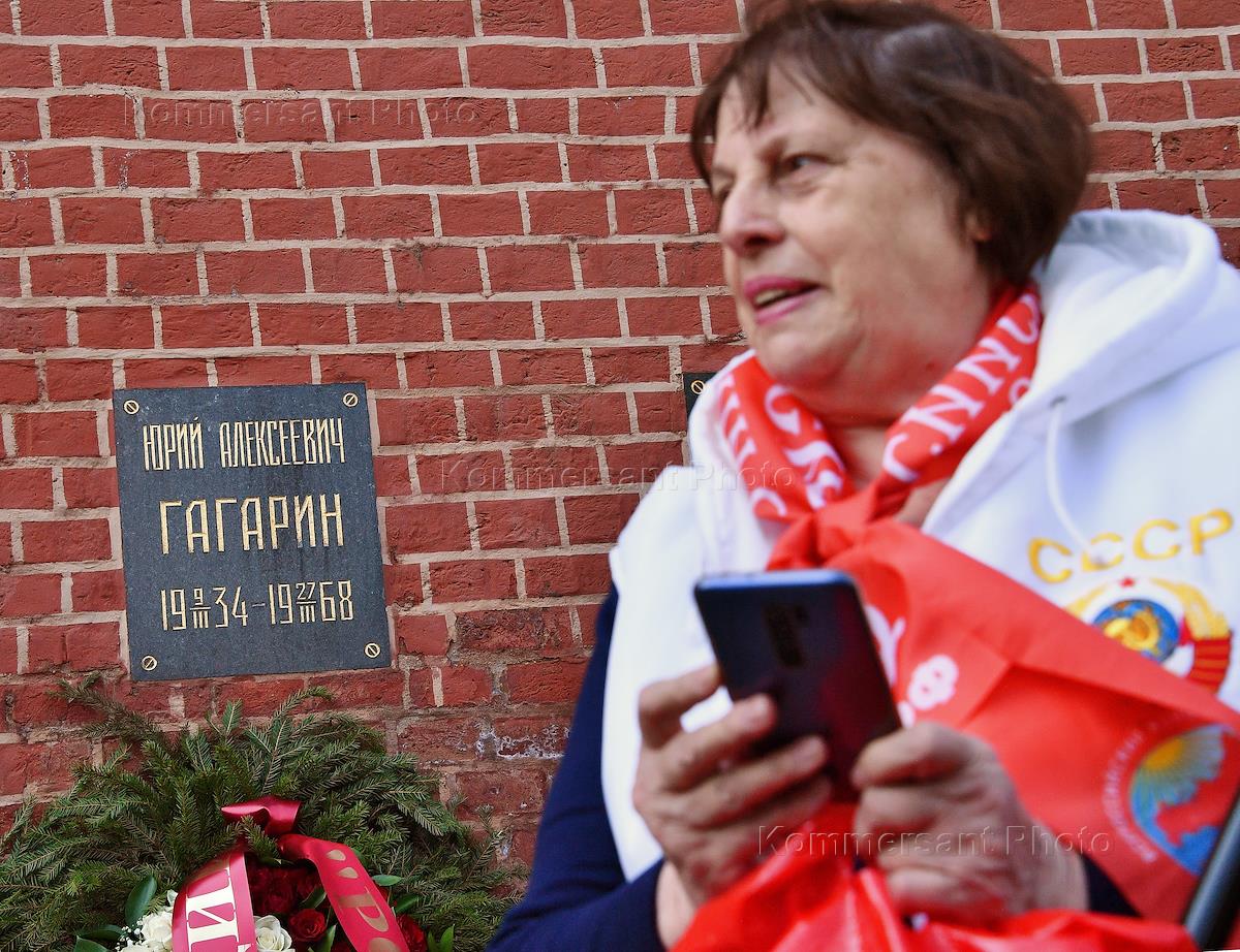 Церемония возложения цветов к месту захоронения космонавта Юрия Гагарина у Кремлевской стены, в…