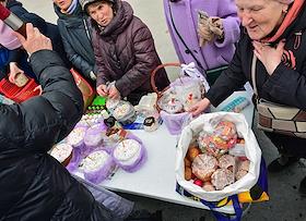 Религия Подготовка к празднованию православной Пасхи в Новосибирске. Освящение пасхальных куличей и яиц накануне православной Пасхи на территории Вознесенского кафедрального собора в Новосибирске.