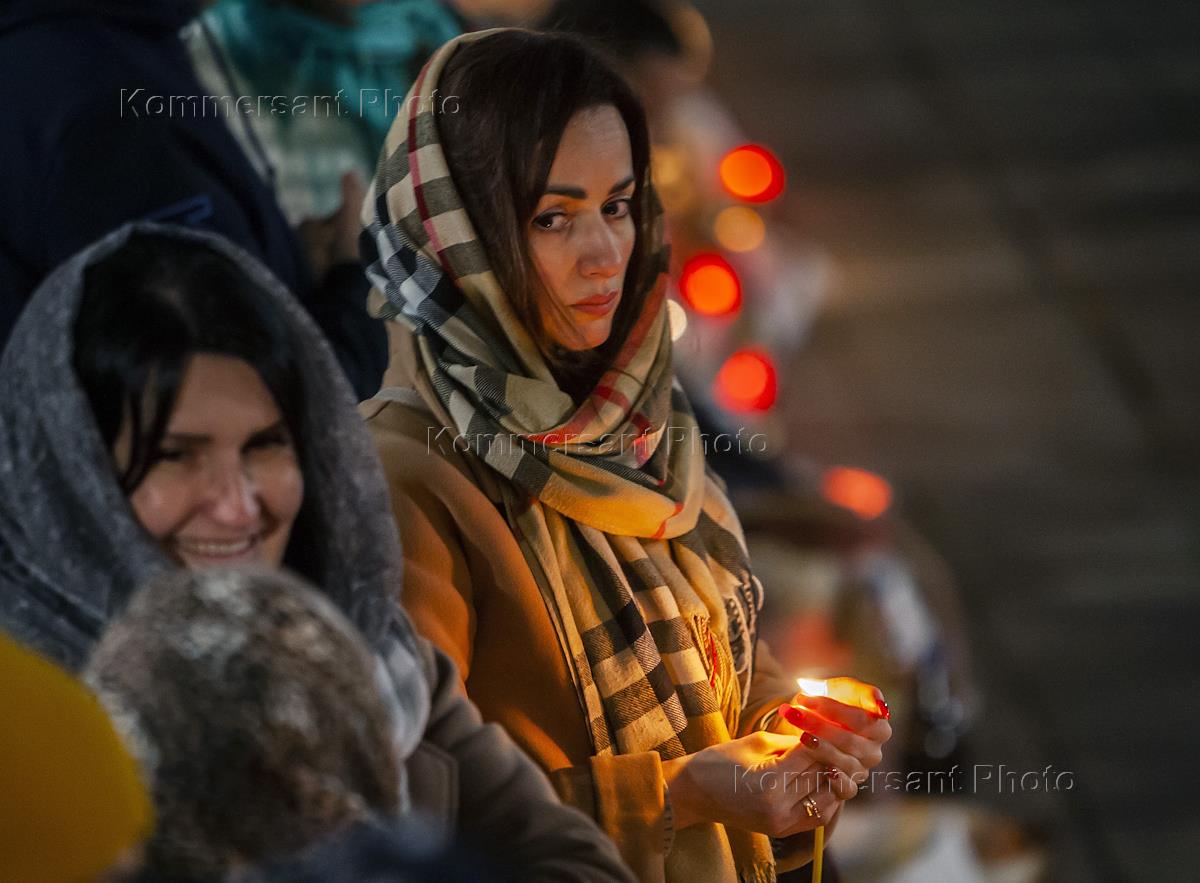 Пасхальное богослужение в Кафедральном Соборе Кишинева. Верующие с благодатным огнем во время…