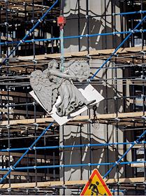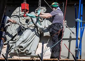 Демонтаж фигуры ангела с Московских триумфальных ворот для реставрационных работ.