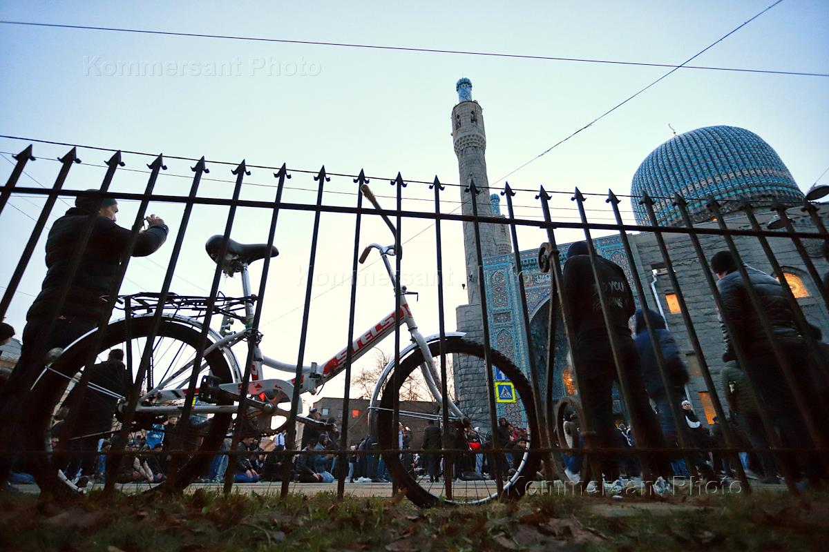 Праздничные мероприятия в день Ураза Байрам возле Санкт-Петербургской Соборной мечети. Верующие во…