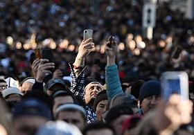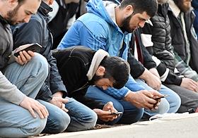 Праздничные мероприятия в день Ураза Байрам в Московской Соборной мечети. Верующие с мобильными…