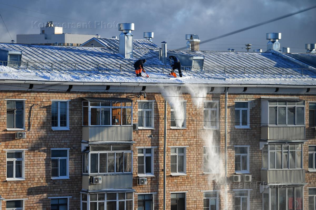 Жанровая фотография. Сотрудники коммунальной службы города во время чистки крыши от снега на жилом…