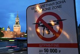 Виды Москвы. Жанровая фотография. Знак "Беспилотная зона" на фоне Спасской башни Московского Кремля…