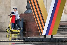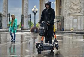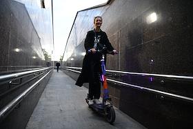 Виды Москвы. Жанровая фотография. Молодые люди едут на электросамокатах.