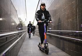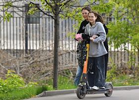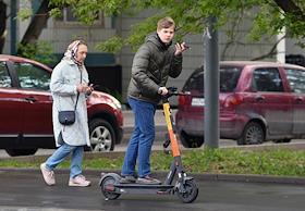Виды Москвы. Жанровая фотография. Молодые люди едут на электросамокатах.