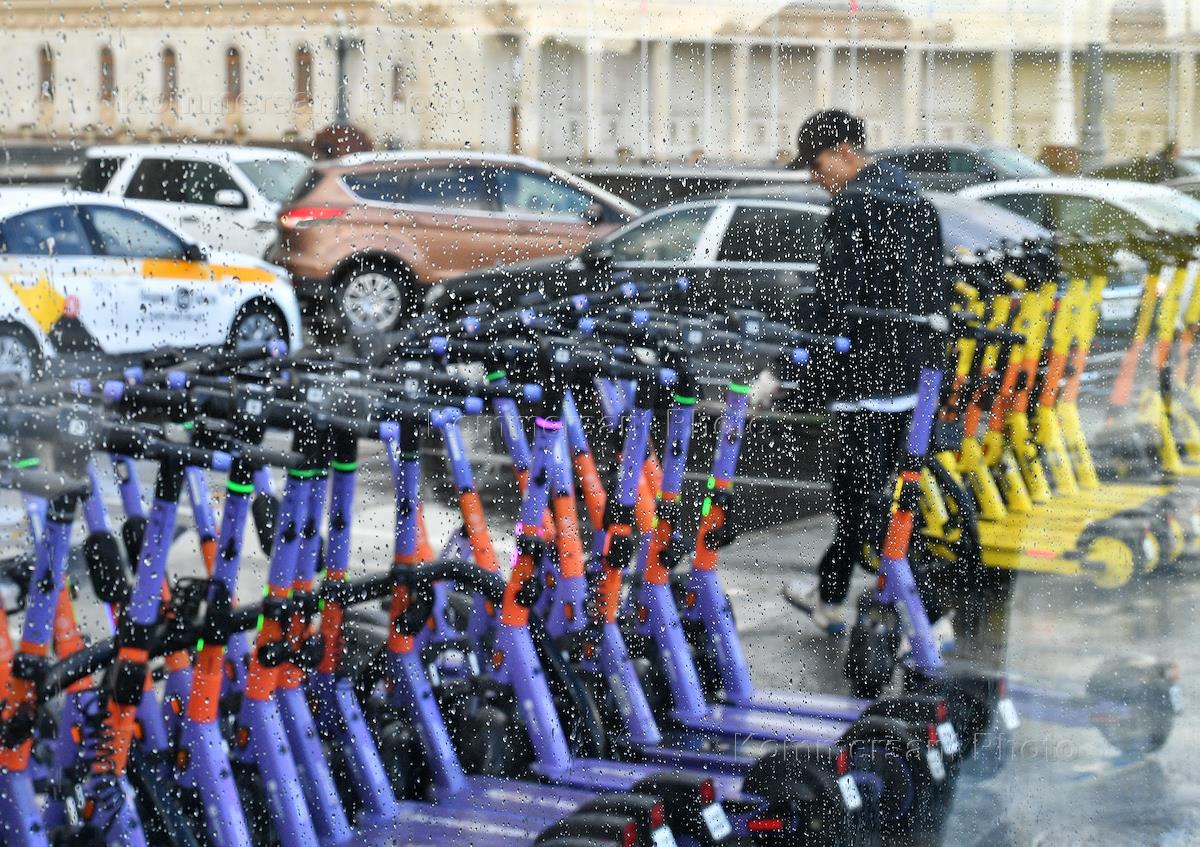 Виды Москвы. Жанровая фотография. Электросамокаты на парковке проката.