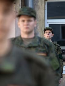 Занятия по строевой военной подготовке в военно-учебном центре Санкт-Петербурга. Жанровая…