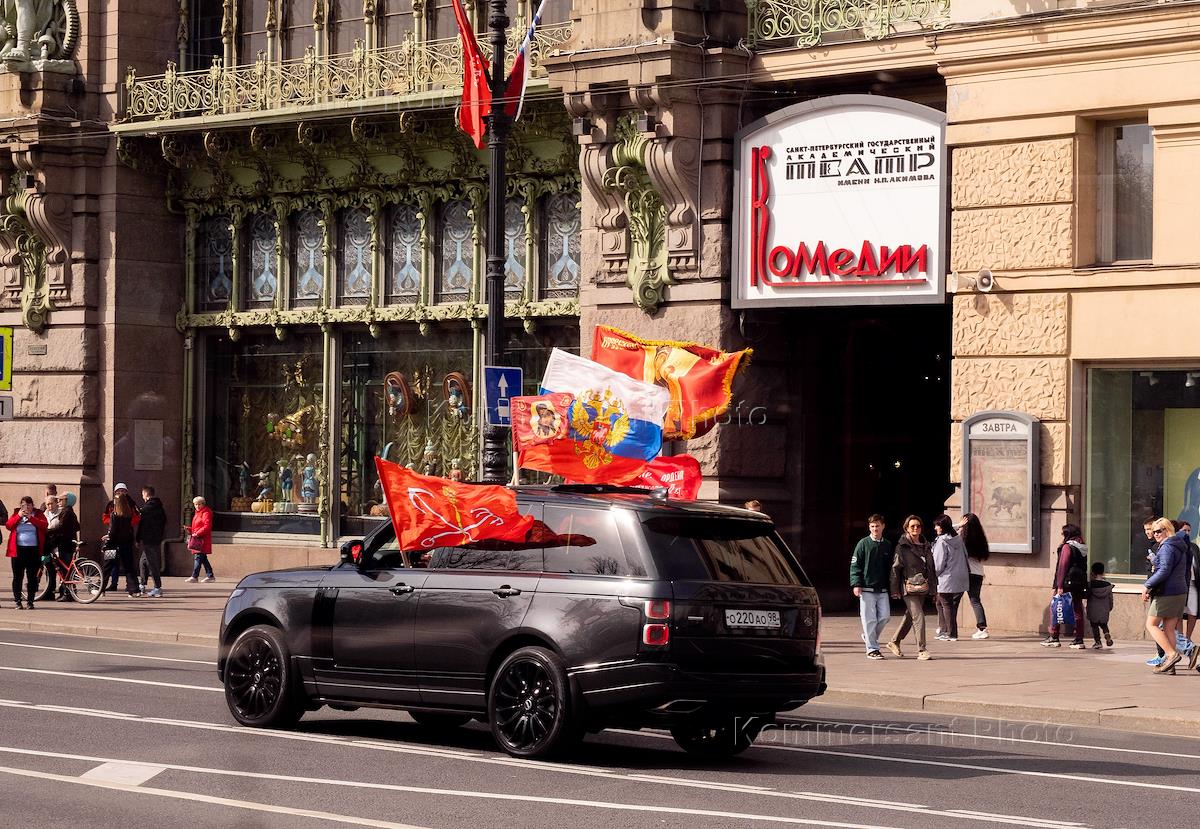 Празднование 78-й годовщины Победы в Великой Отечественной войне. Автомобиль, украшенный флагами, на…