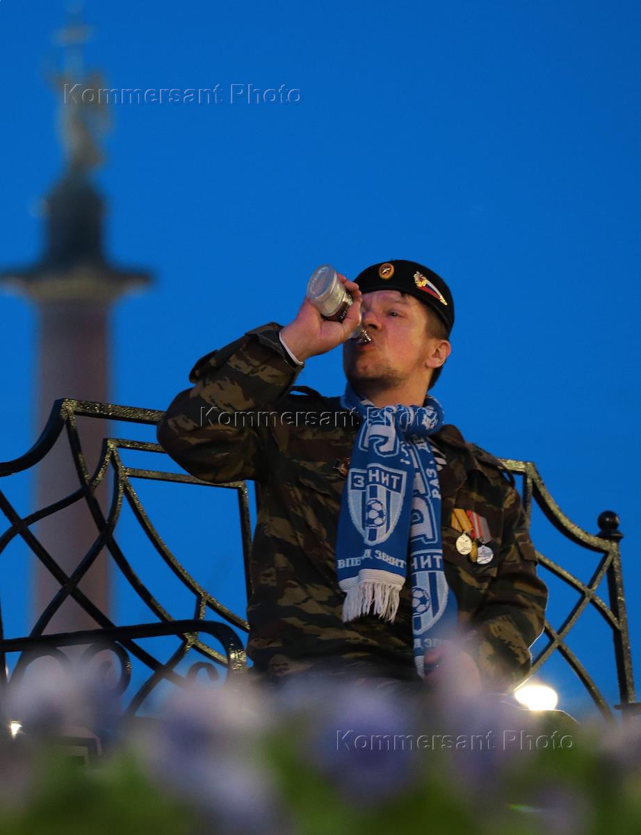 Болельщики футбольного клуба Зенита празднуют чемпионство команды.