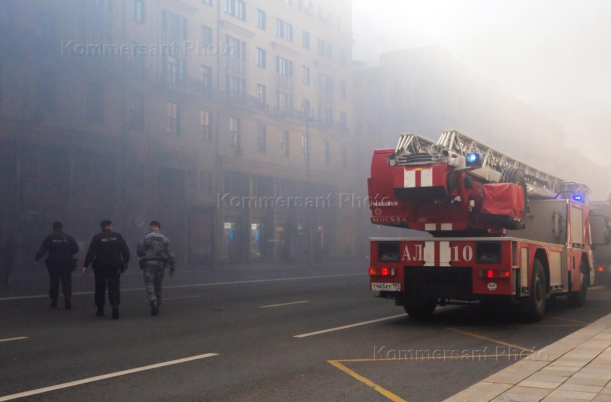 Пожар на стройке недалеко от гостиницы «Интерконтиненталь» в центре Москвы на Тверской улице по адресу Тверская, 22.