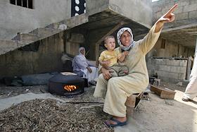 Война в Ливане. Ливанская женщина с ребенком сидит у очага во дворе дома в городе Кана.
