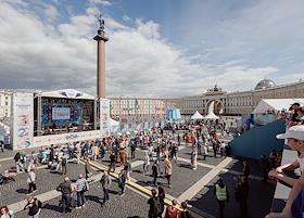 XVIII Международный Санкт-Петербургский Книжный салон на Дворцовой площади. Посетители у сцены во…