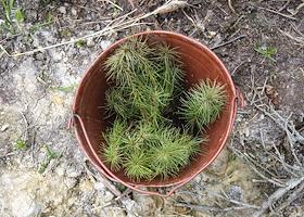 Посадка саженцев в лесопарковой зоне Санкт-Петербурга. Жанровая фотография. Саженцы сосны в ведре.