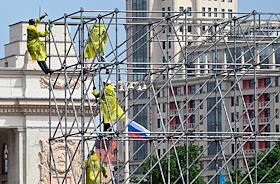 Празднование Дня пограничника. Жанровая фотография. Монтажники во время монтажа конструкции в Парке…