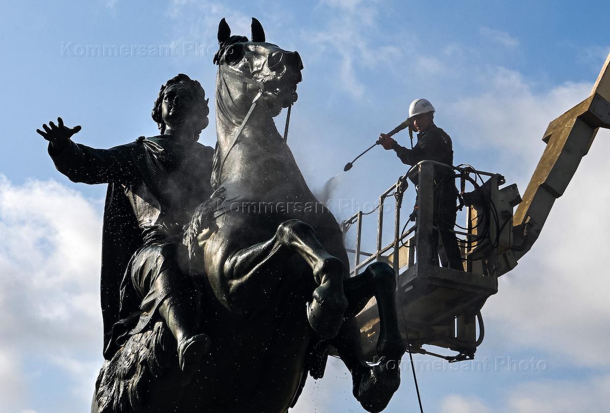 Жанровая фотография. Профилактическая реставрация - промывка памятника императору Петру I ("Медный…