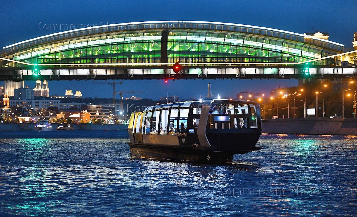 Виды вечерней Москвы. Жанровая фотография. Электрический речной трамвай на Москве-реке. Московский…