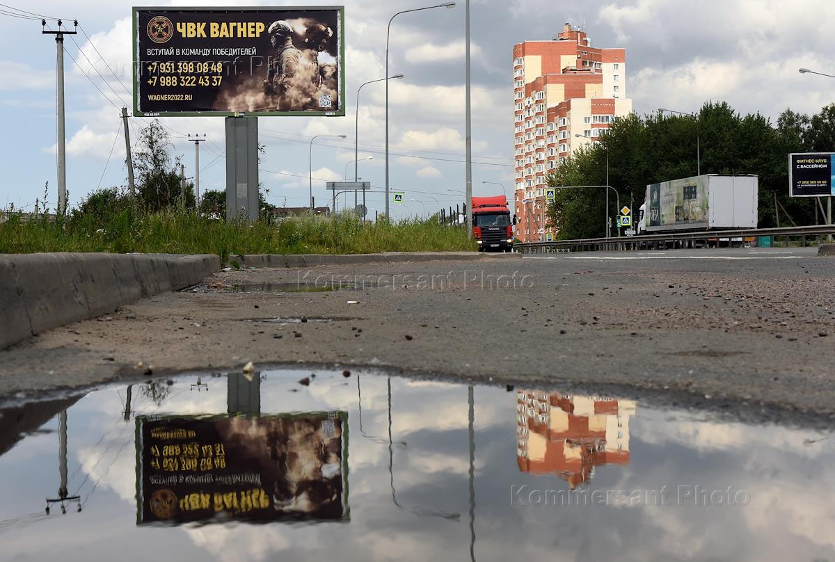Виды Санкт-Петербурга. Жанровая фотография. Плакат ЧВК "Вагнер" на рекламном щите.