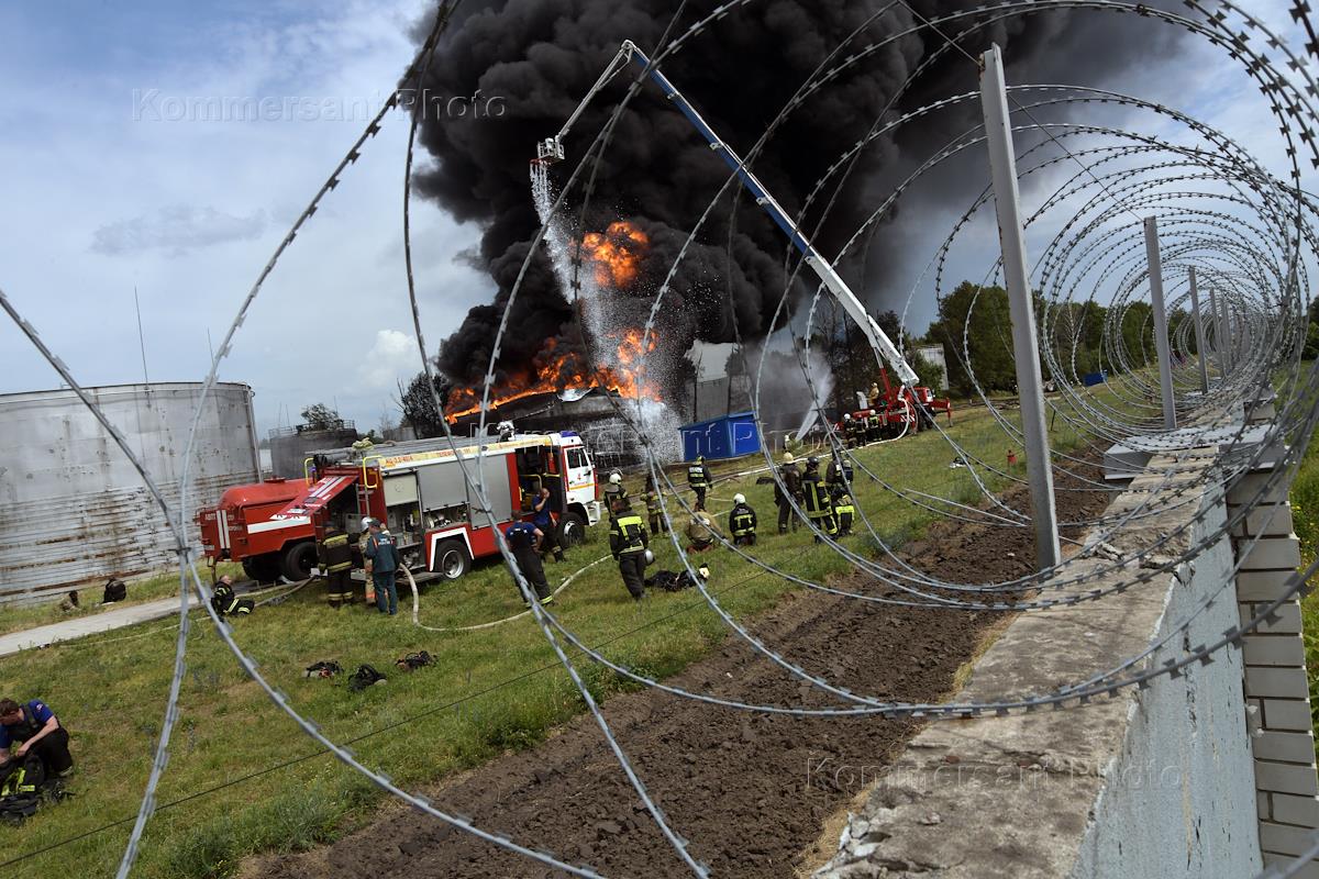 Пожар на нефтебазе на улице Димитрова. Сотрудники Государственной противопожарной службы (ГПС) во…