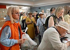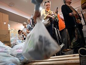 День открытых дверей в благотворительном фонде "Банк еды "Русь". Жанровая фотография. Люди в очереди…