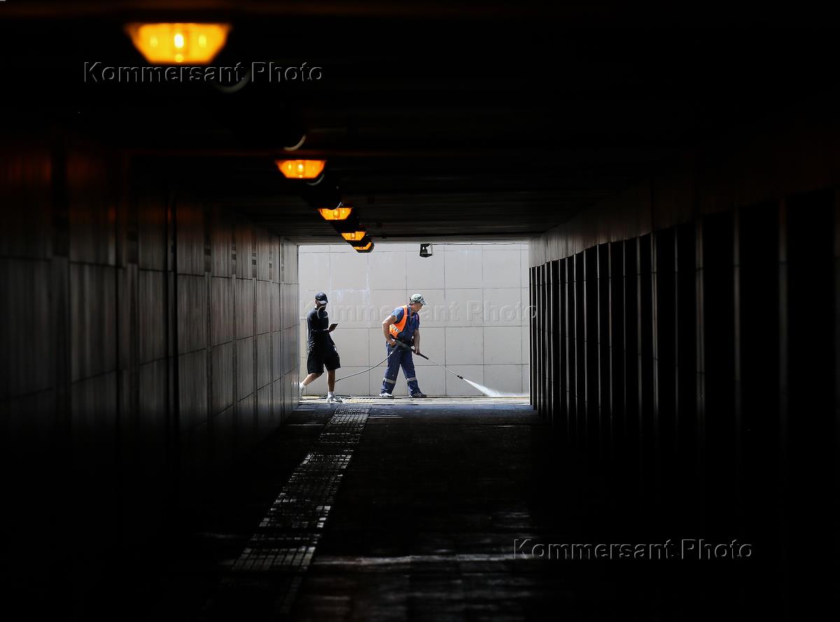 Жанровая фотография. Рабочие во время мытья подземного перехода.