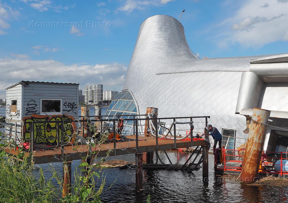 Виды Санкт-Петербурга. Полузатонувший плавучий ресторан "Серебряный кит" компании "Фарсэй" в…