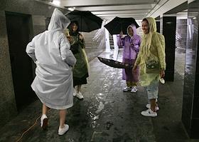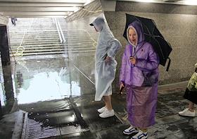 Виды Нижнего Новгорода во время проливного дождя. Жанровая фотография. Женщины в дождевиках и с…