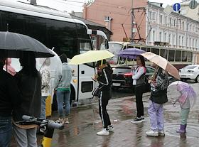 Виды Нижнего Новгорода во время дождя. Жанровая фотография. Пассажиры с зонтами на остановке…