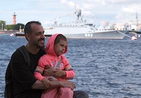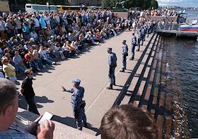 Репетиция парада ко Дню Военно-Морского флота (ВМФ) в акватории Невы. Жанровая фотография. Зрители…