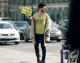 Виды Санкт-Петербурга. Невский проспект. Жанровая фотография. Молодой человек рекламирует прогулки…