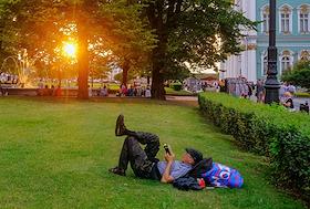 Виды Санкт-Петербурга. Жанровая фотография. Мужчина отдыхает на лужайке.